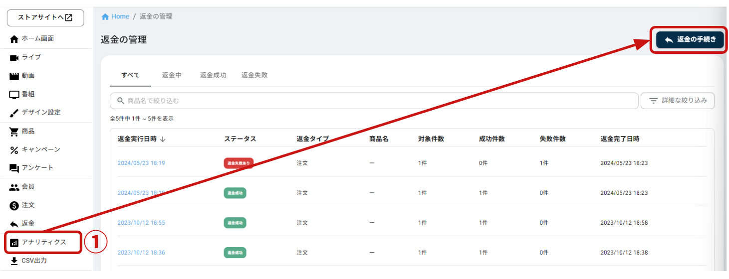 ①サイドメニューより「返金」をクリックし、右上の「返金の手続き」ボタンをクリックします