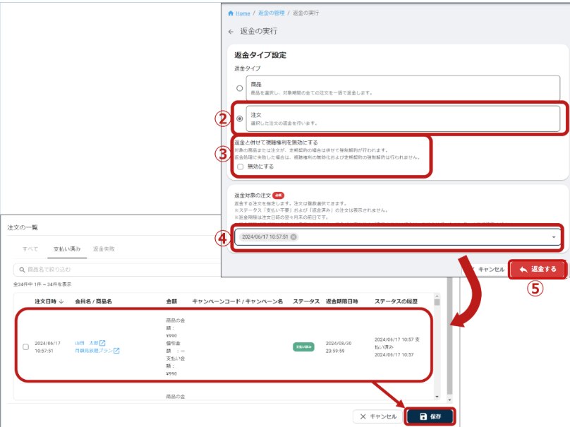 ④「返金対象の注文」の入力欄をクリックし、注文の一覧画面から返金したい注文にチェックを入れ、「保存」をクリックします