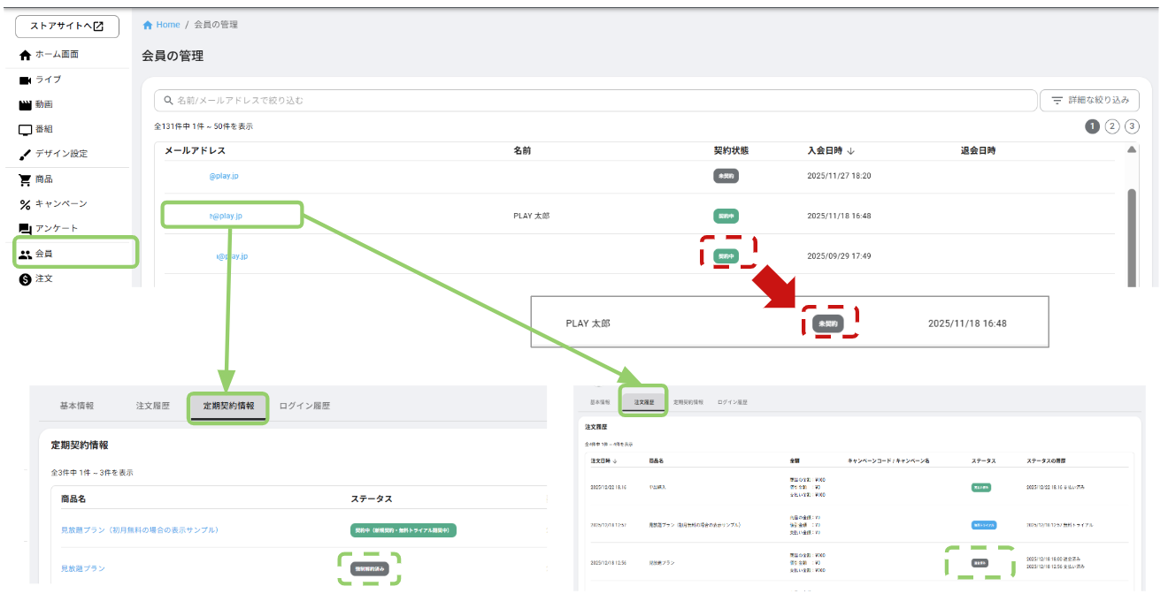 返金と同時に定期契約の強制解約を行なった場合は、「会員」画面では、ステータスが「契約中」から「未契約」に変わります