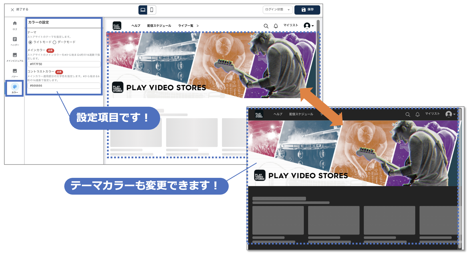 フロントサイトのテーマカラーや会員登録ボタンなどのサービスカラーの変更ができます。