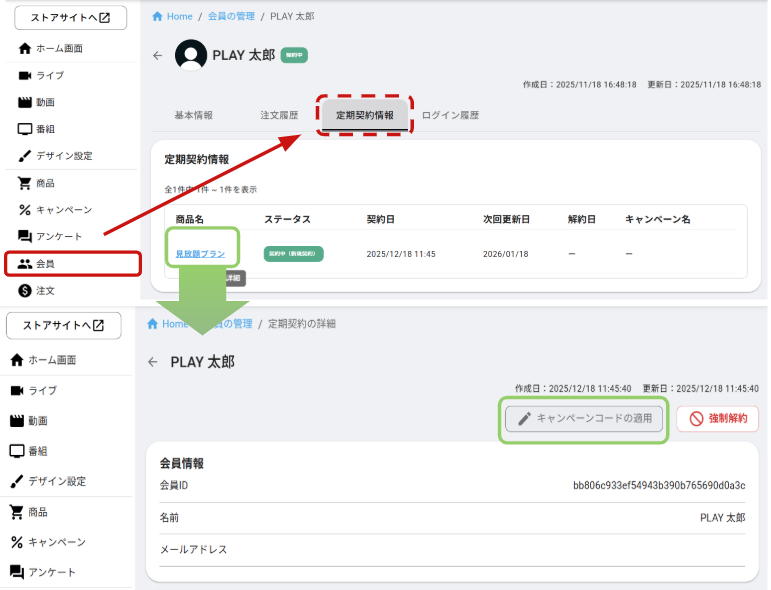 契約時にキャンペーンコードの入力を忘れた会員に対しキャンペーンの後付けをする場合や、既存定期契約者に対して新たなキャンペーンを適用したい場合などに便利な機能です。