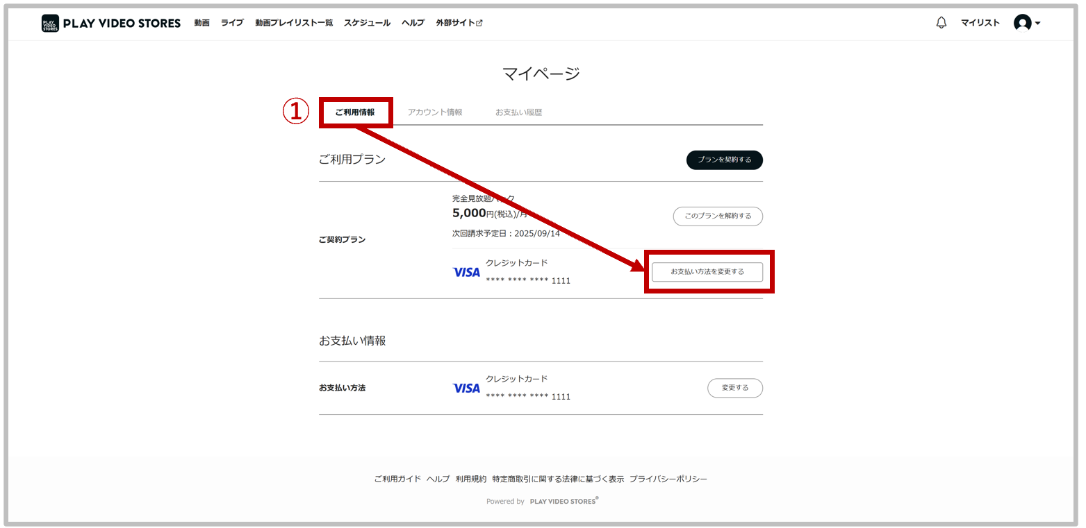 1.「ご利用情報」のタブを開きご契約プランの「お支払い方法を変更する」ボタンを押下します