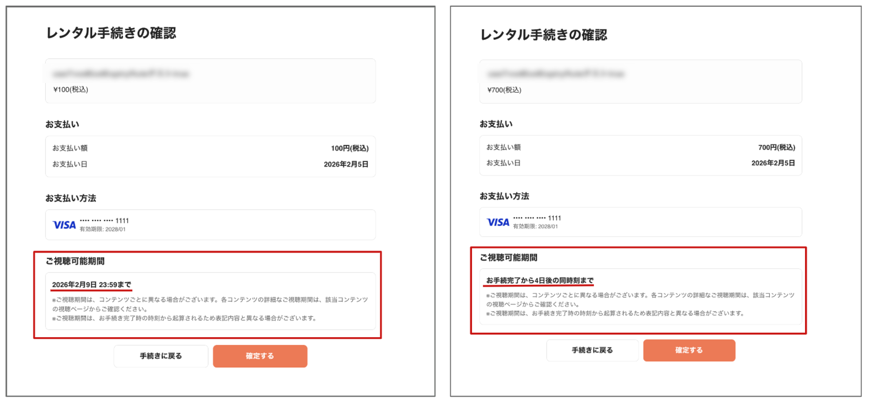 また、購入確認画面にてお客様が購入操作を進める際、どちらの設定であっても視聴期限の目安を正しく認識いただけるようご視聴可能期間について表記しております。