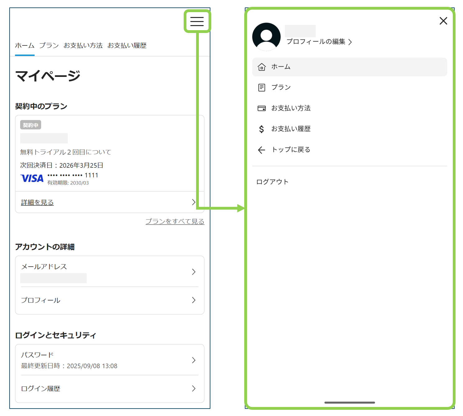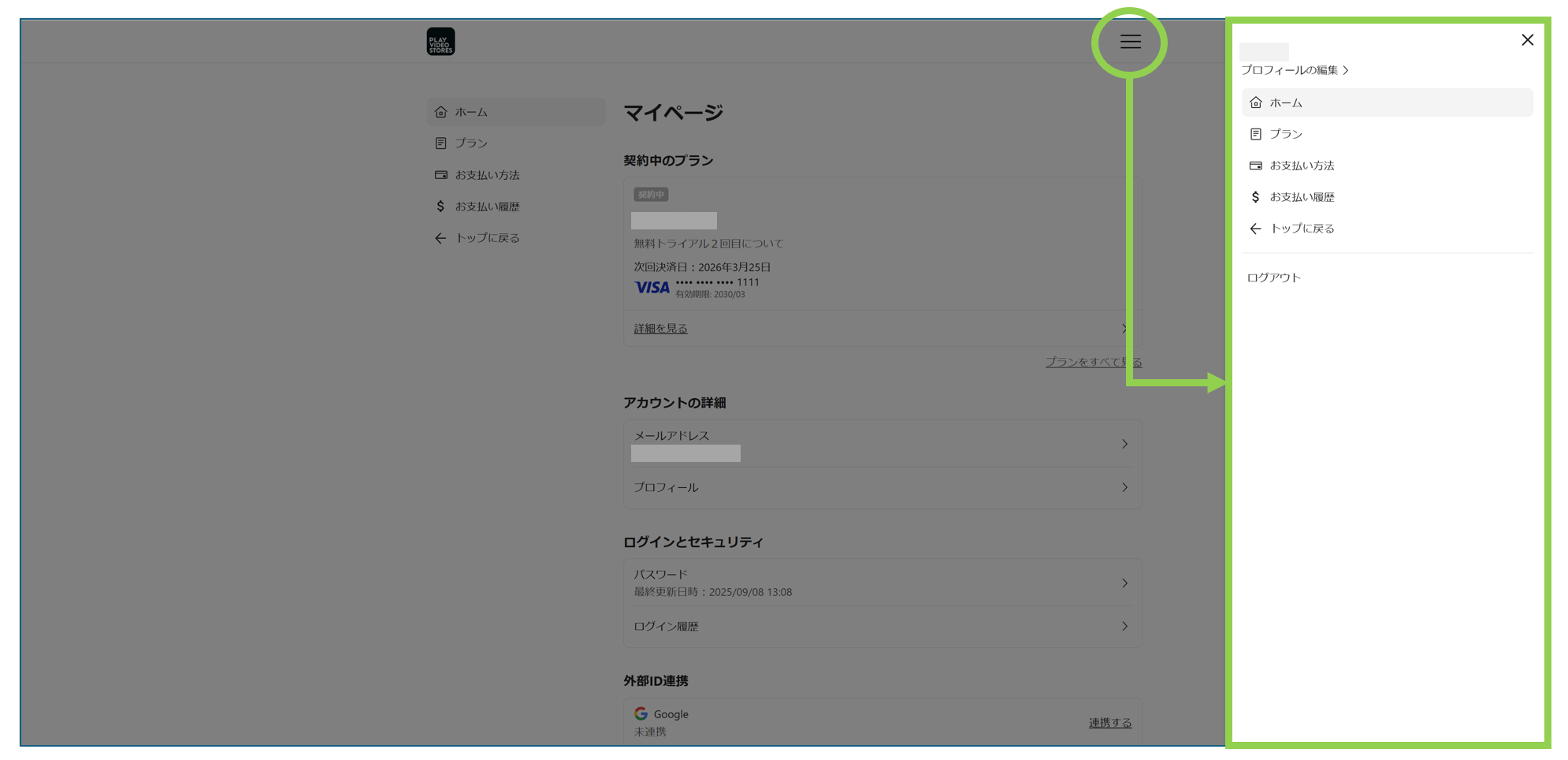 マイページのUI変更により、ストアサイトのマイページ画面にて、右上の3本線のメニューボタン「≡」をクリックすると、スライド式でメニューが表示されるようになりました。